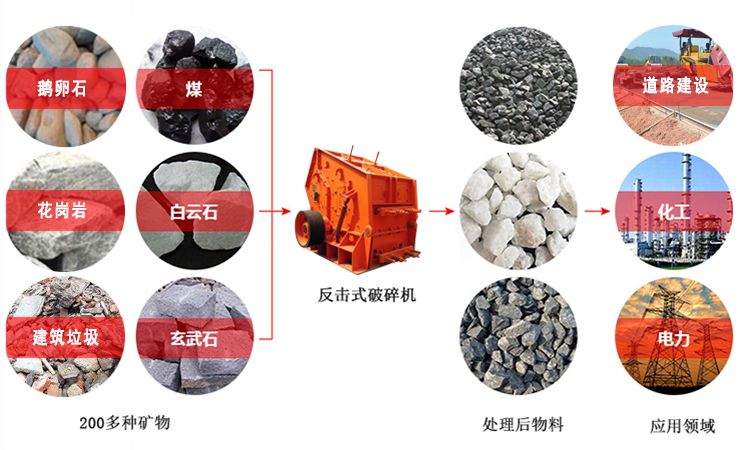 通常情況下,反擊式破碎機不單獨工作,與振動喂料機、顎式破碎機、振動篩、皮帶輸送機、集中電控柜等設備可組成成套石料生產線。