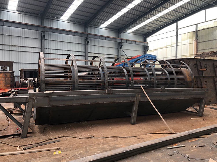 轉(zhuǎn)筒洗石機(jī)采用中心結(jié)構(gòu),螺旋葉片在筒內(nèi)壁上,由減速器連接到中心軸上進(jìn)行工作。借助固體顆粒的比重不同,因而在液體中沉降的速度不同的原理,進(jìn)行機(jī)械清洗的一種設(shè)備。滾筒洗石機(jī)的清洗筒體有鋼架支撐,電機(jī)帶動(dòng)減速機(jī),皮帶動(dòng)清洗筒體低速旋轉(zhuǎn)。含有泥團(tuán)和石粉的骨料自進(jìn)料口給入,進(jìn)入旋轉(zhuǎn)的滾筒內(nèi),被清洗滾筒內(nèi)安裝有一定角度的耐磨橡膠襯板不斷帶起拋落,自進(jìn)料端到出料端移動(dòng)過(guò)程中多次循環(huán),并被順向或逆向的沖洗水沖涮洗滌,清洗干凈的骨料經(jīng)過(guò)卸料端筒篩篩分脫水后排出。含有污泥的廢水則通過(guò)出料或給料端的帶孔擋板流出。